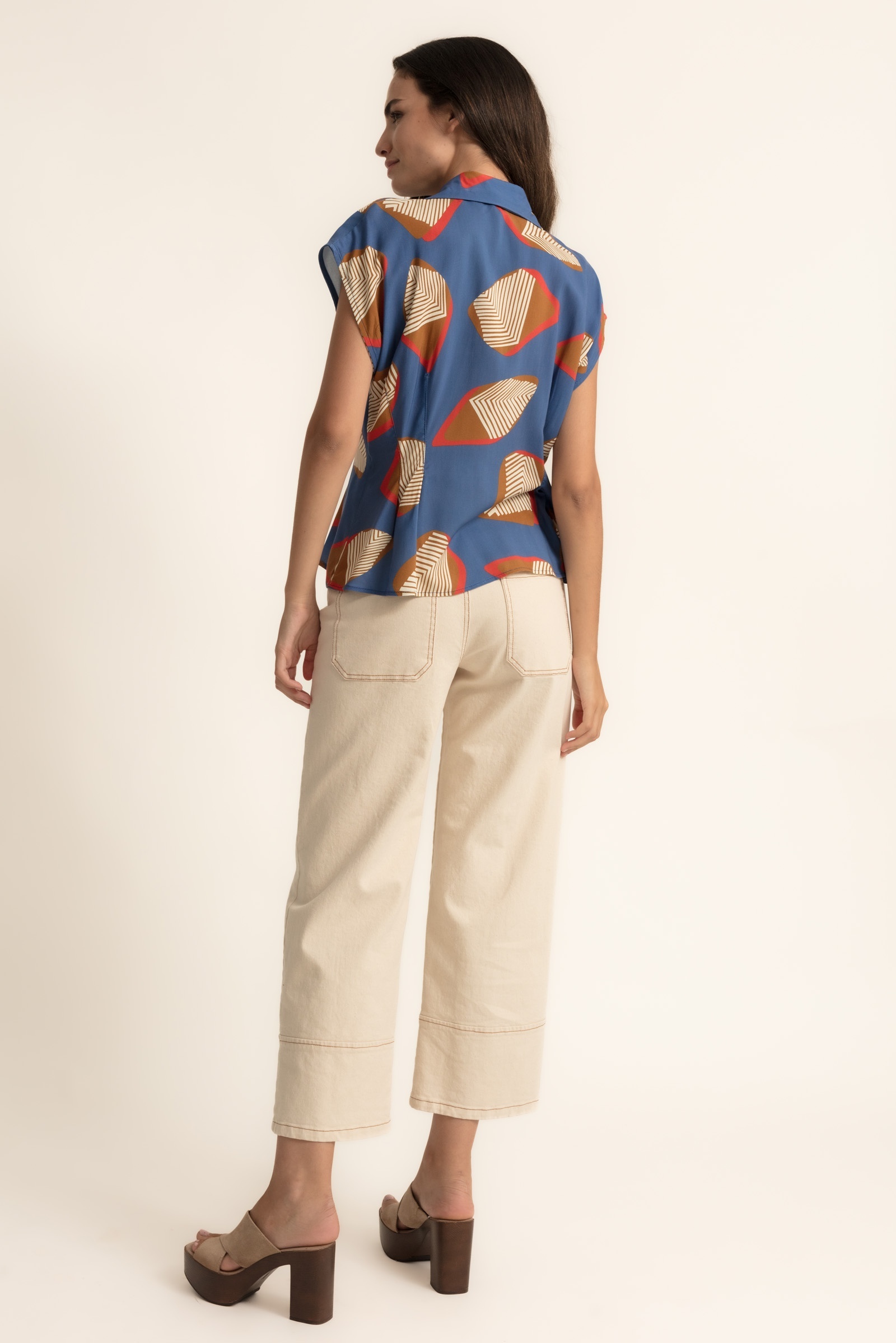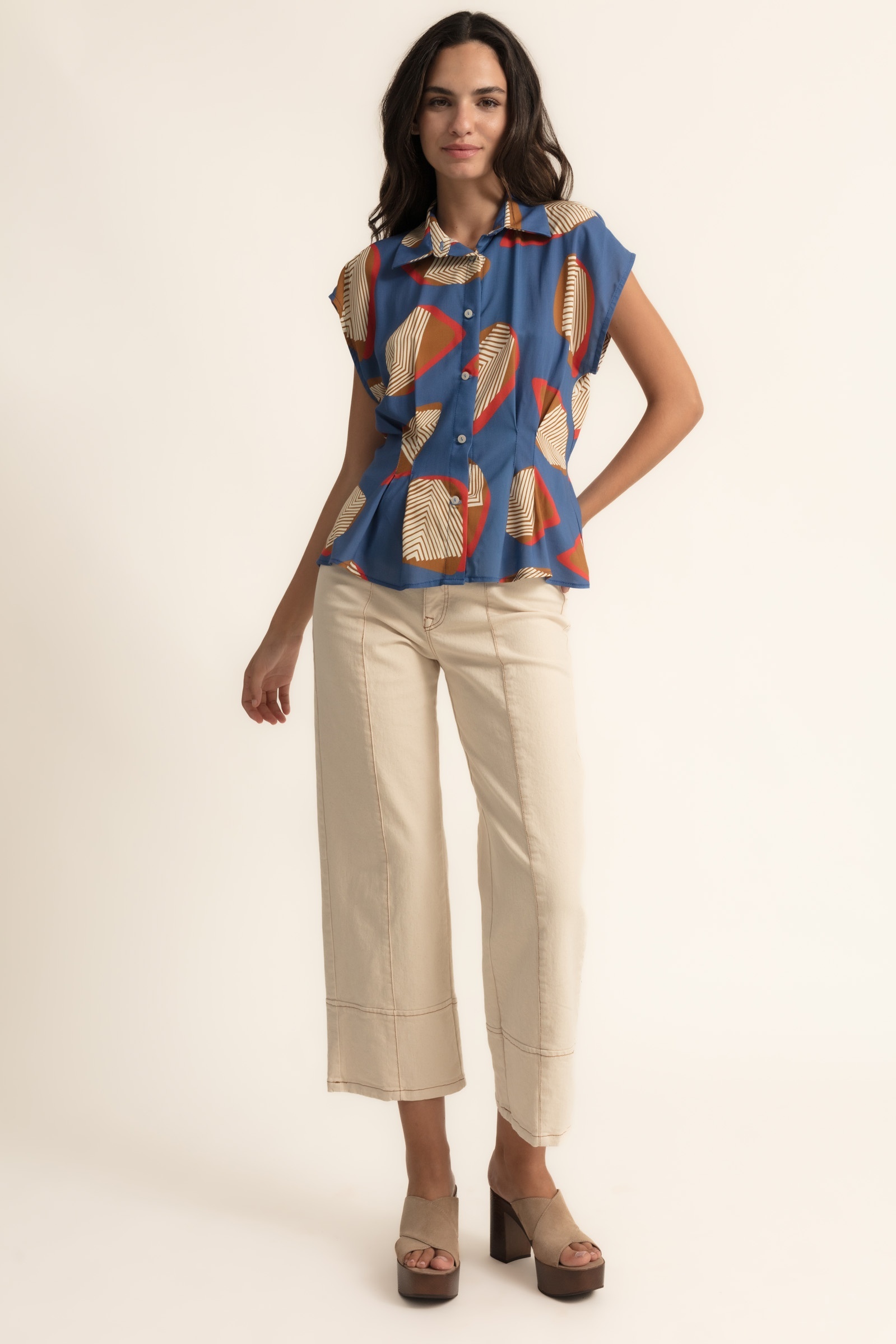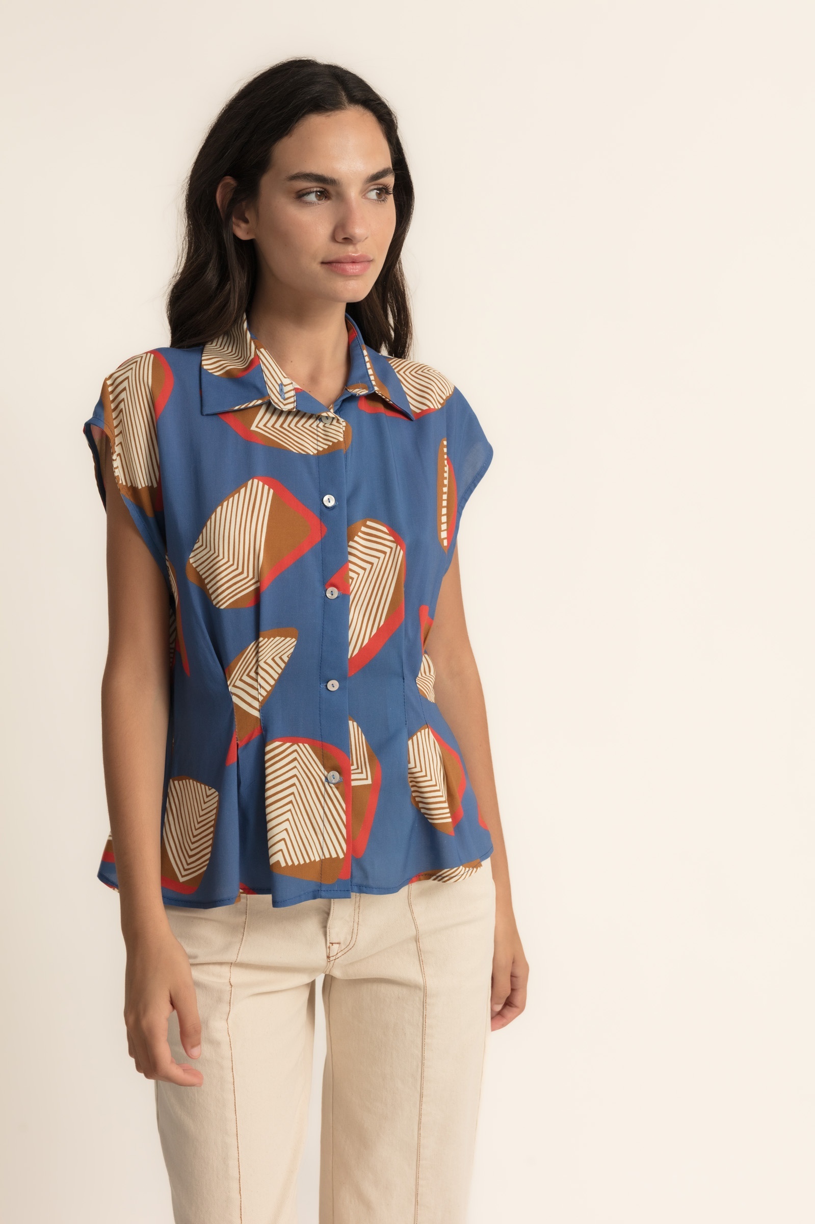 Top viscose blauw met plooitjes.