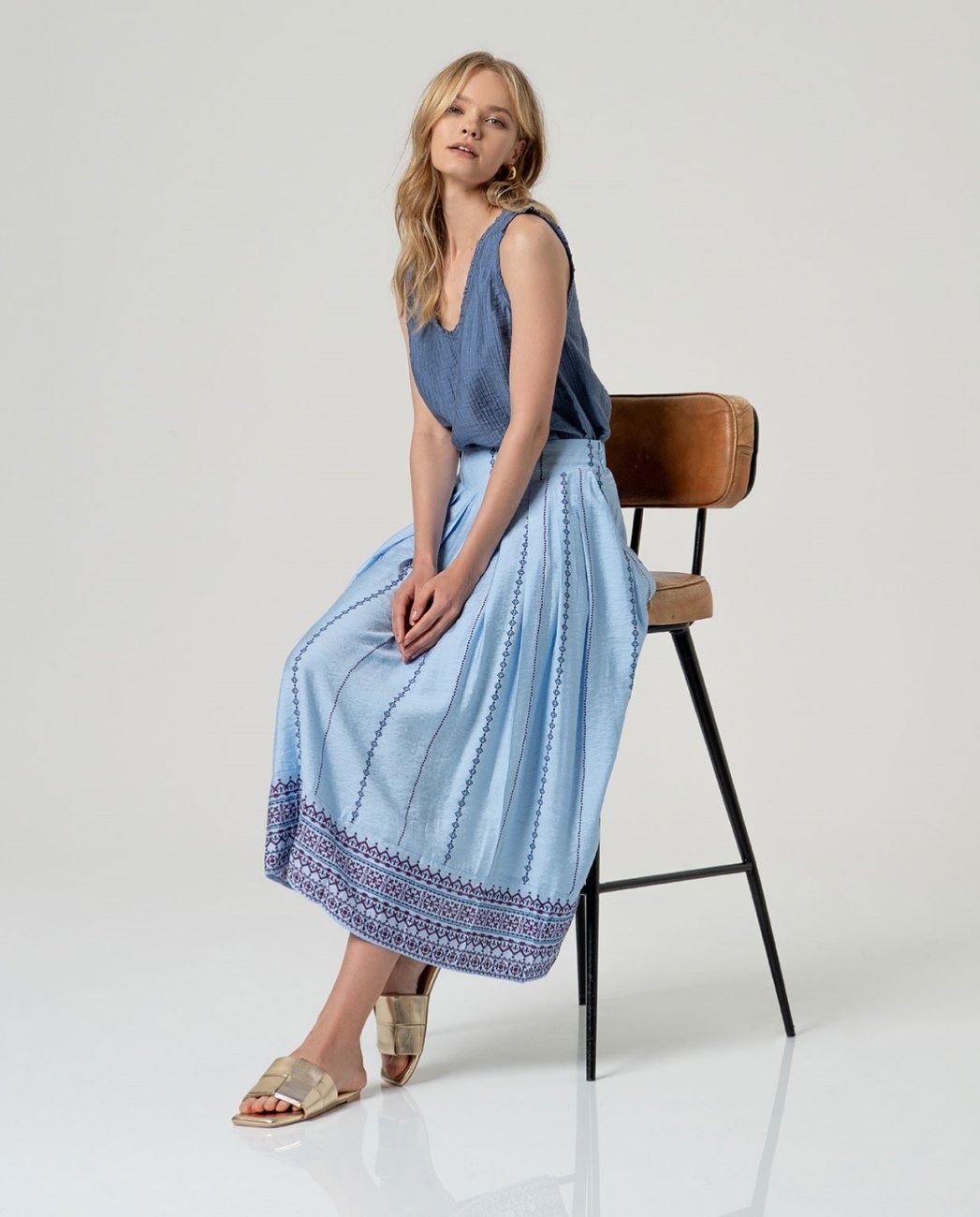Rok met geborduurd lijkende kant rand en elastische taille.